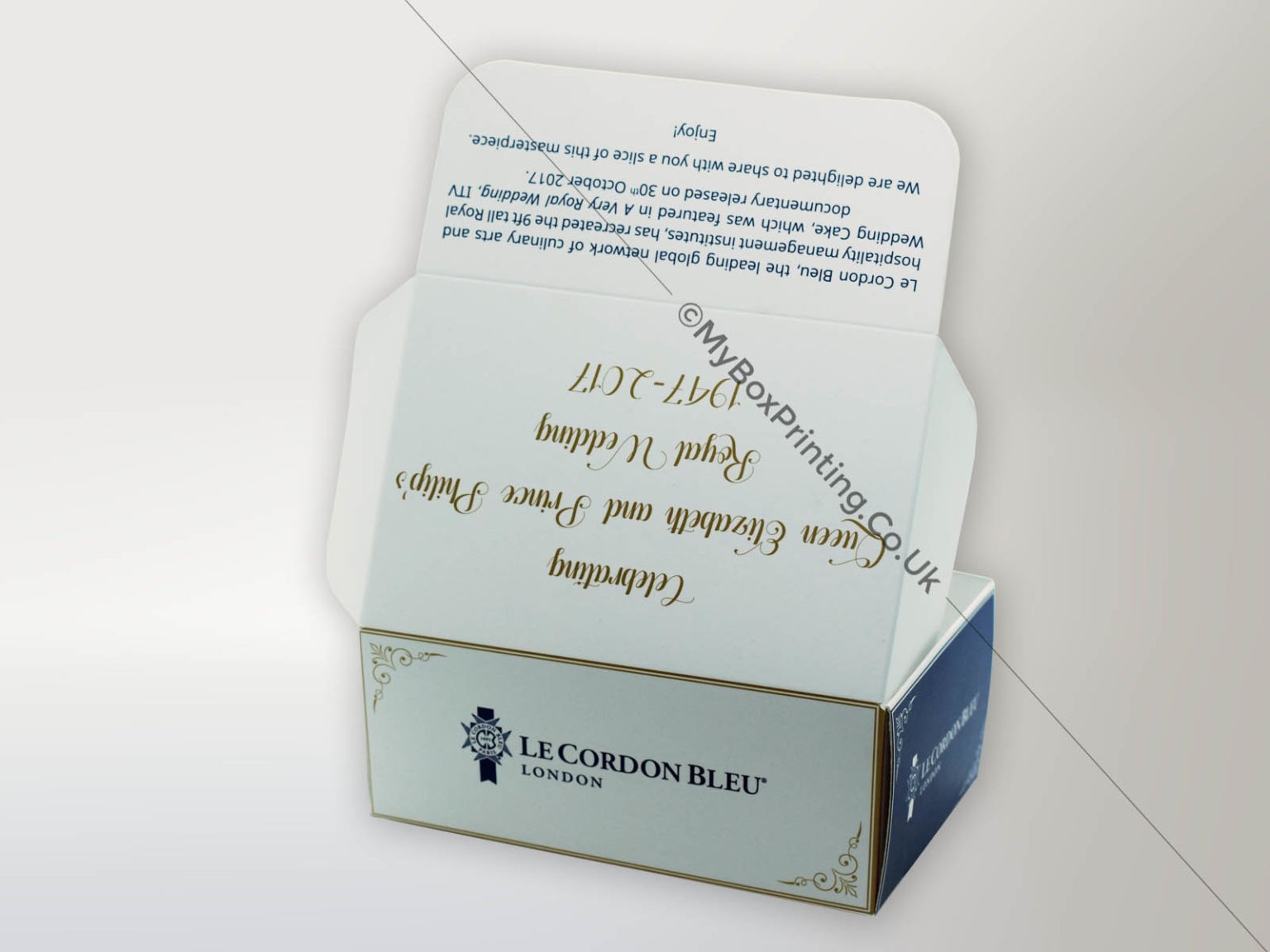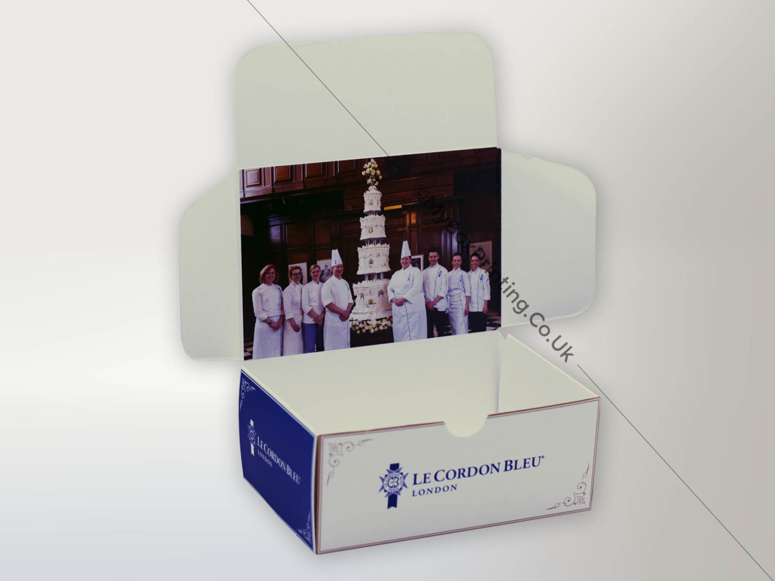Le Cordon Bleu had recreated “The Royal Wedding Cake” to celebrate the wedding anniversary of Queen Elizabeth and Prince Philip. They required us to make packaging boxes to pack the slices of that cake. These 0426 style cake slice boxes were made with high quality cardboard stock and features full colour printing.