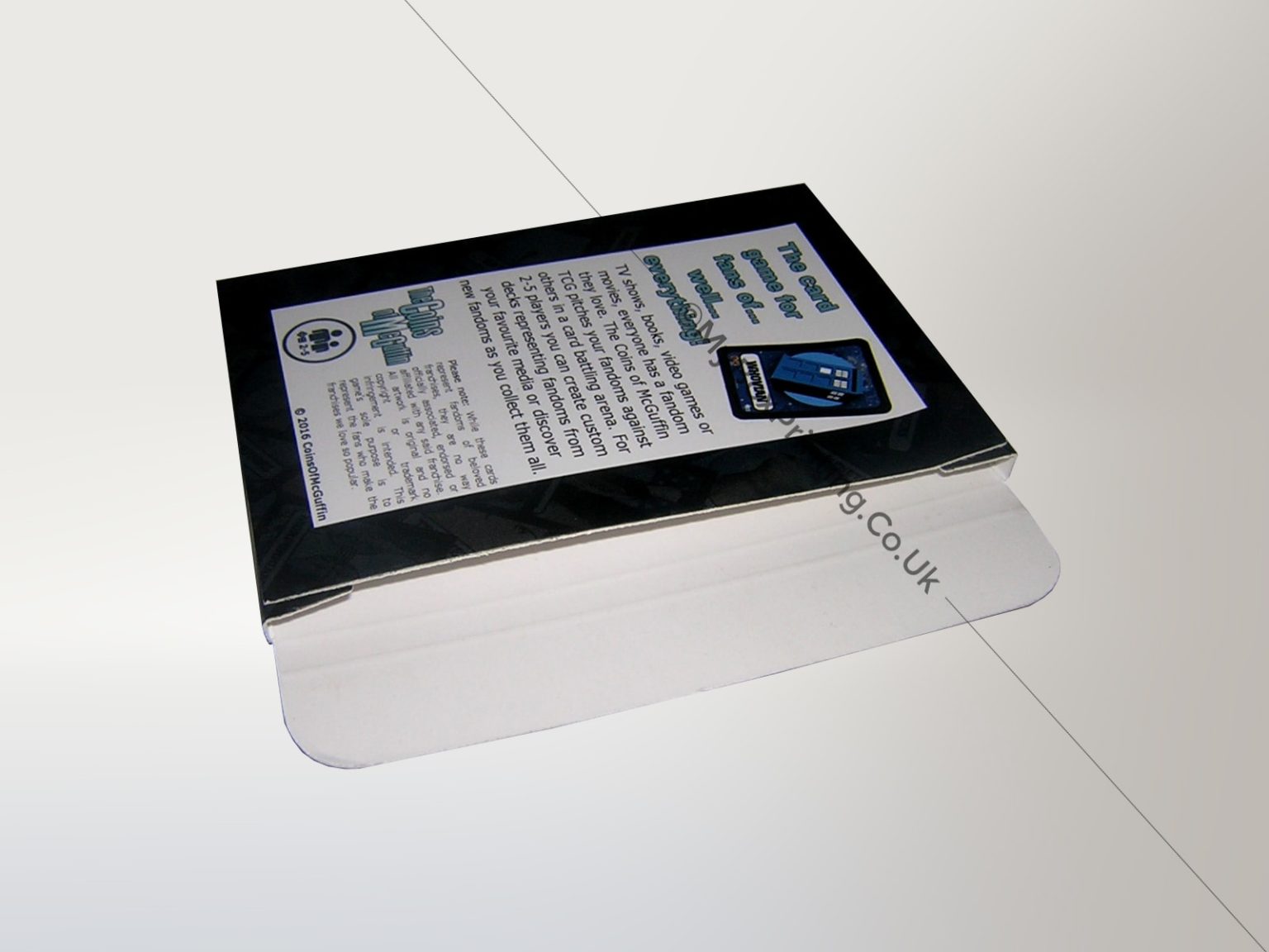 The Coins of McGuffin approached us to make branded product packaging boxes for their products. We used 250gsm cardboard stock for their card game boxes with matte lamination and printed the boxes in full colour. These are envelope style pre assembled/prefabricated boxes.