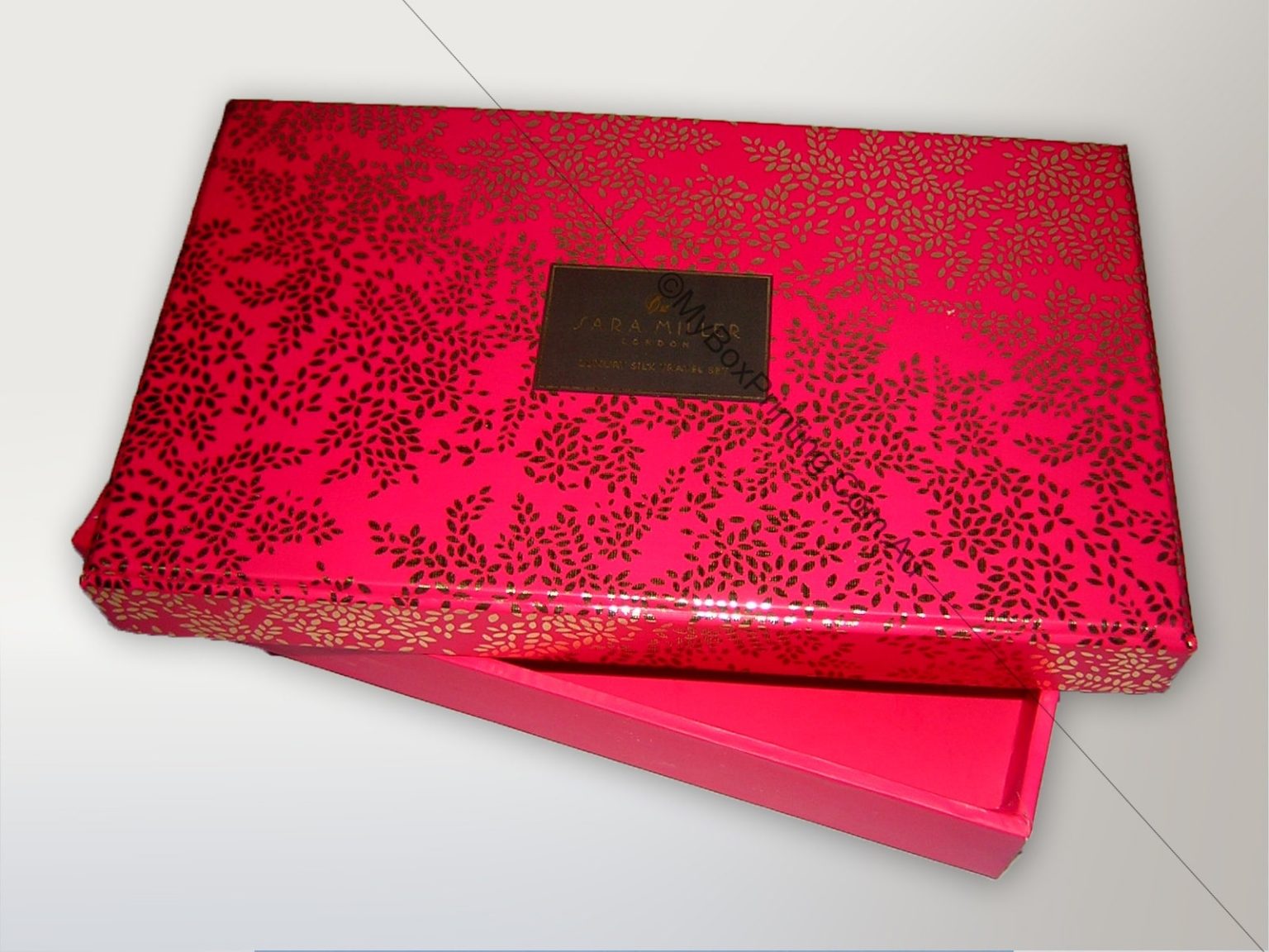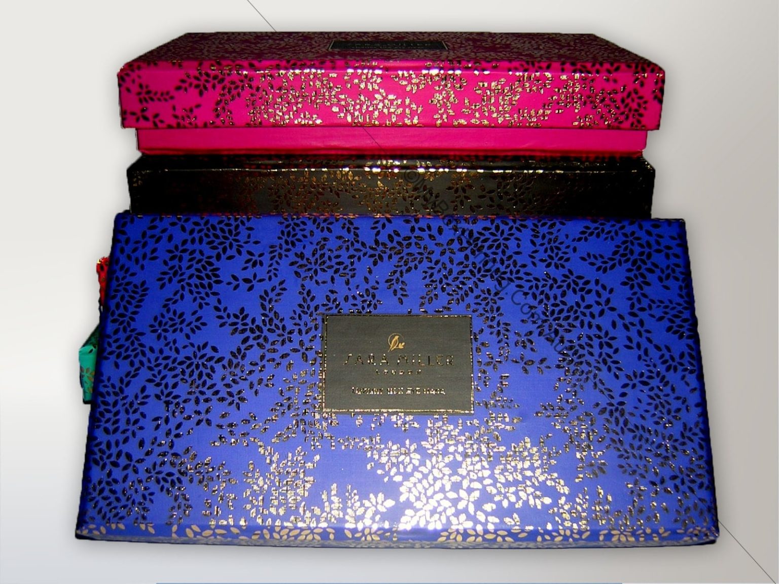 Sara Miller is a British designer who expresses her passion for travel and love of different cultures in her art. My Box printing is proud to supply retail luxury boxes for her brand. These preassembled luxurious boxes in a best possible way were made with 1000gsm hardboard and linen paper and were printed in different coloured textured printing featuring metallic gold branding and gold foiled design.