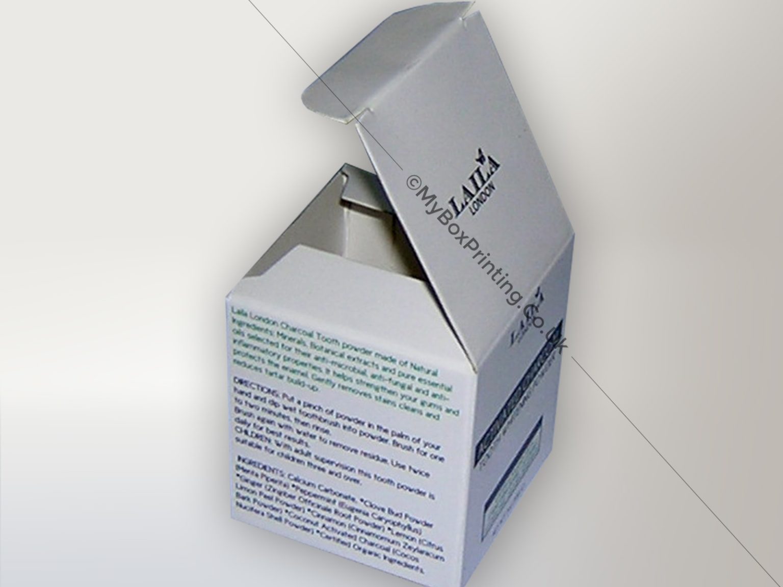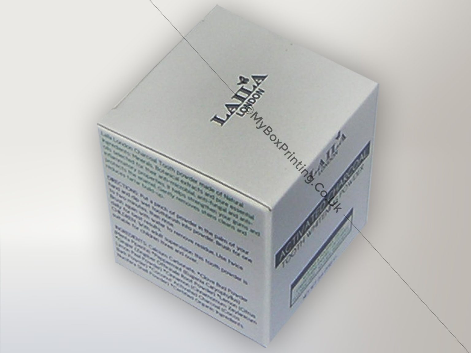 Laila London is the home of natural organic skincare and home fragrances. They ordered boxes for their tooth whitening powder. We delivered boxes made with 350gsm silk card and with gloss lamination.