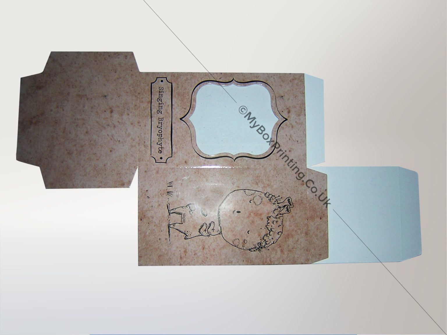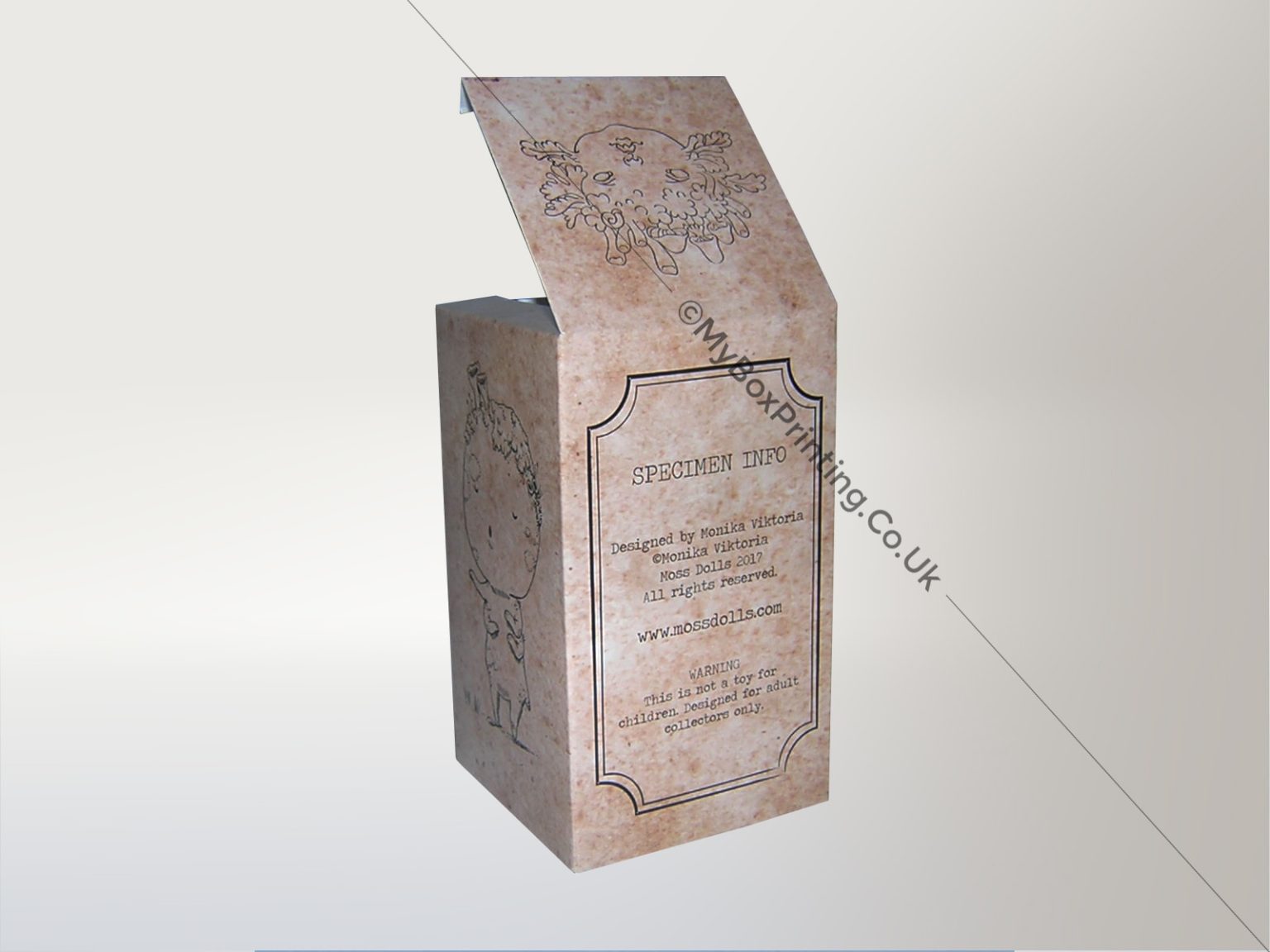 Moss Dolls is the creation of Monika Viktoria – an artist and illustrator based in Leura, Australia. She contacted us to make branded toy boxes for her self designed doll collection. We used 350gsm cardboard and printed her design in two colours. These boxes were finished with gloss lamination and feature a pvc display window.